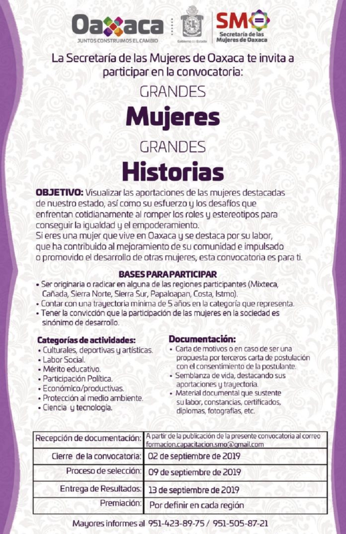 La Secretaría de las Mujeres de Oaxaca (SMO) invita a la sociedad en general a participar en la postulación de “Grandes Mujeres, Grandes Historias”, con el objetivo de visualizar las aportaciones de mujeres destacadas de la entidad, así como su esfuerzo y los desafíos que enfrentan cotidianamente al romper los roles y estereotipos de género, para conseguir el empoderamiento y la igualdad sustantiva.