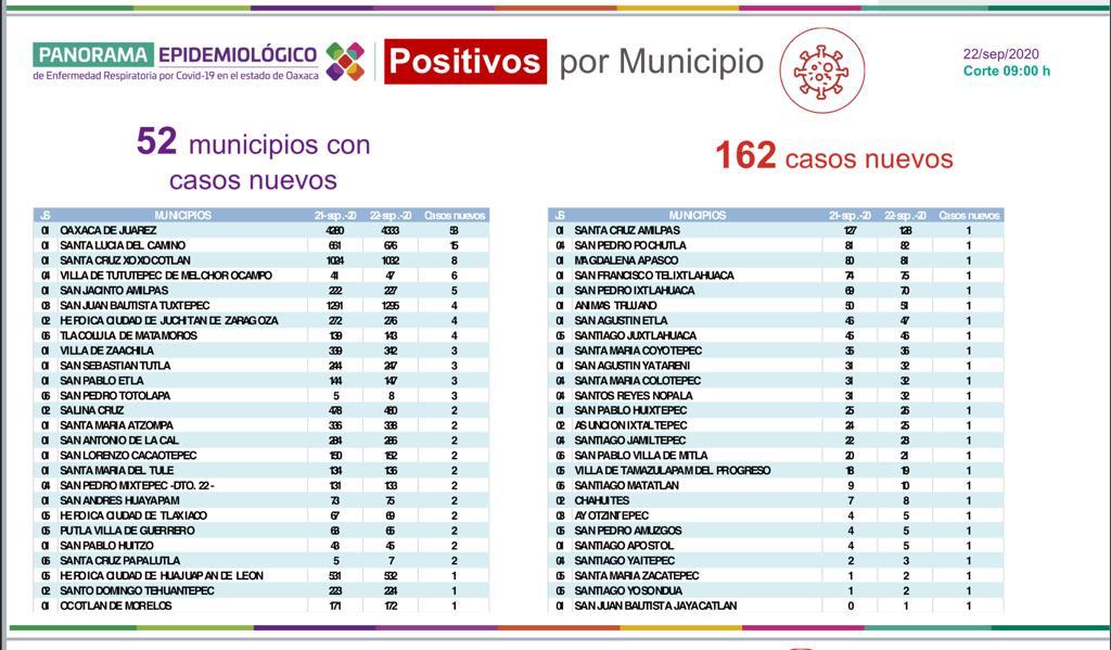 Asimismo, destacó que hoy fueron 52 localidades que presentaron casos nuevos, encabezando la lista Oaxaca de Juárez con 53, Santa Lucía del Camino 15, Santa Cruz Xoxocotlán ocho, Villa de Tututepec de Melchor Ocampo seis, San Jacinto Amilpas cinco, por mencionar algunos.