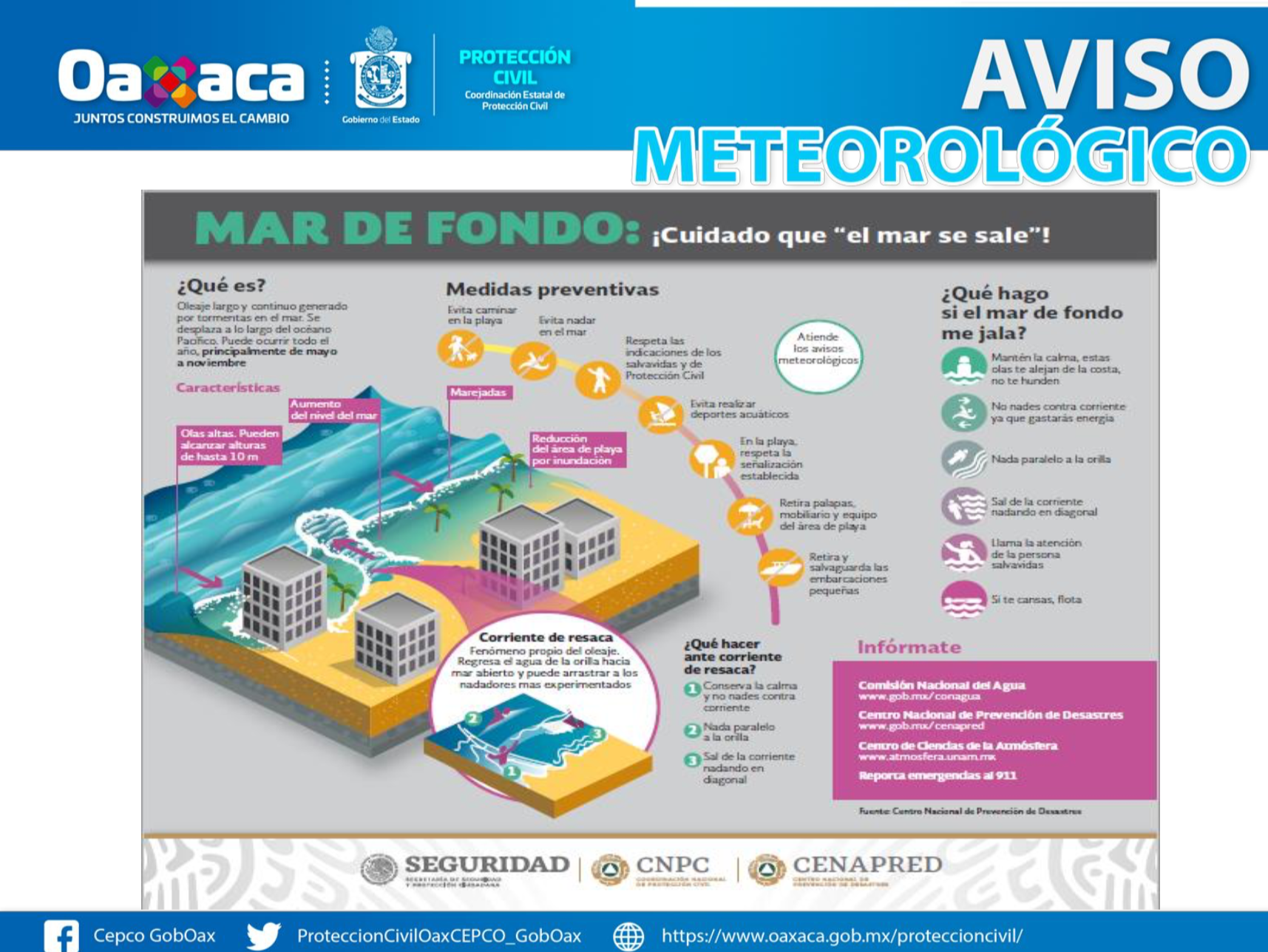 La Coordinación Estatal de Protección Civil de Oaxaca (CEPCO), informa que para la tarde de este viernes, se espera la presencia de un “evento de mar de fondo” en todo lo largo de la línea de costa de la entidad.