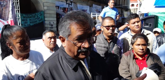 Integrantes del movimiento Antorcha Campesina en Oaxaca, encabezados por su dirigente Gabriel Hernández García, realizaron un mitin frente al Palacio de Gobierno para exigir justicia por los asesinatos en la región de la Mixteca, así como un alto total a la impunidad en el estado.