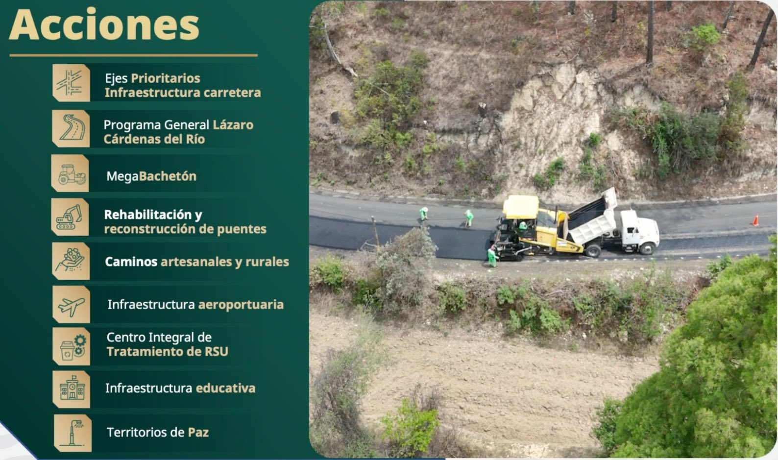 El programa Mega Bachetón contempla la repavimentación de 787 kilómetros en 2026, mientras que continúa la rehabilitación de puentes y la atención a caminos rurales y artesanales en distintas regiones.