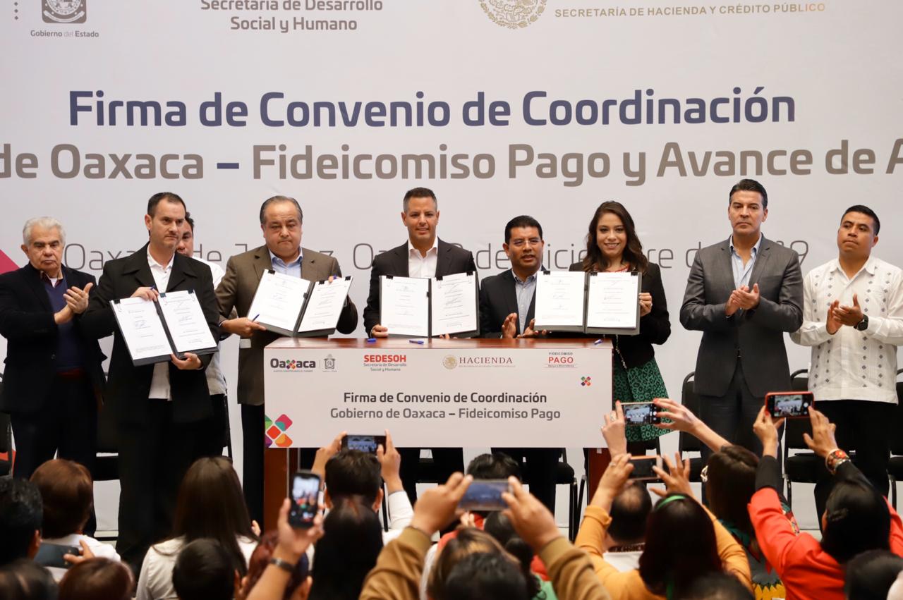 El gobernador Alejandro Murat Hinojosa firmó el Convenio de Coordinación entre el Gobierno del Estado y el apoderado legal del Fideicomiso PAGO, José Ricardo Álvarez Juárez; que permitirá realizar el pago a los ahorradores defraudados de las 18 sociedades cooperativas, que contaban con montos de ahorro de hasta 40 mil pesos, respetando el límite legal del 70% del saldo neto de ahorro.