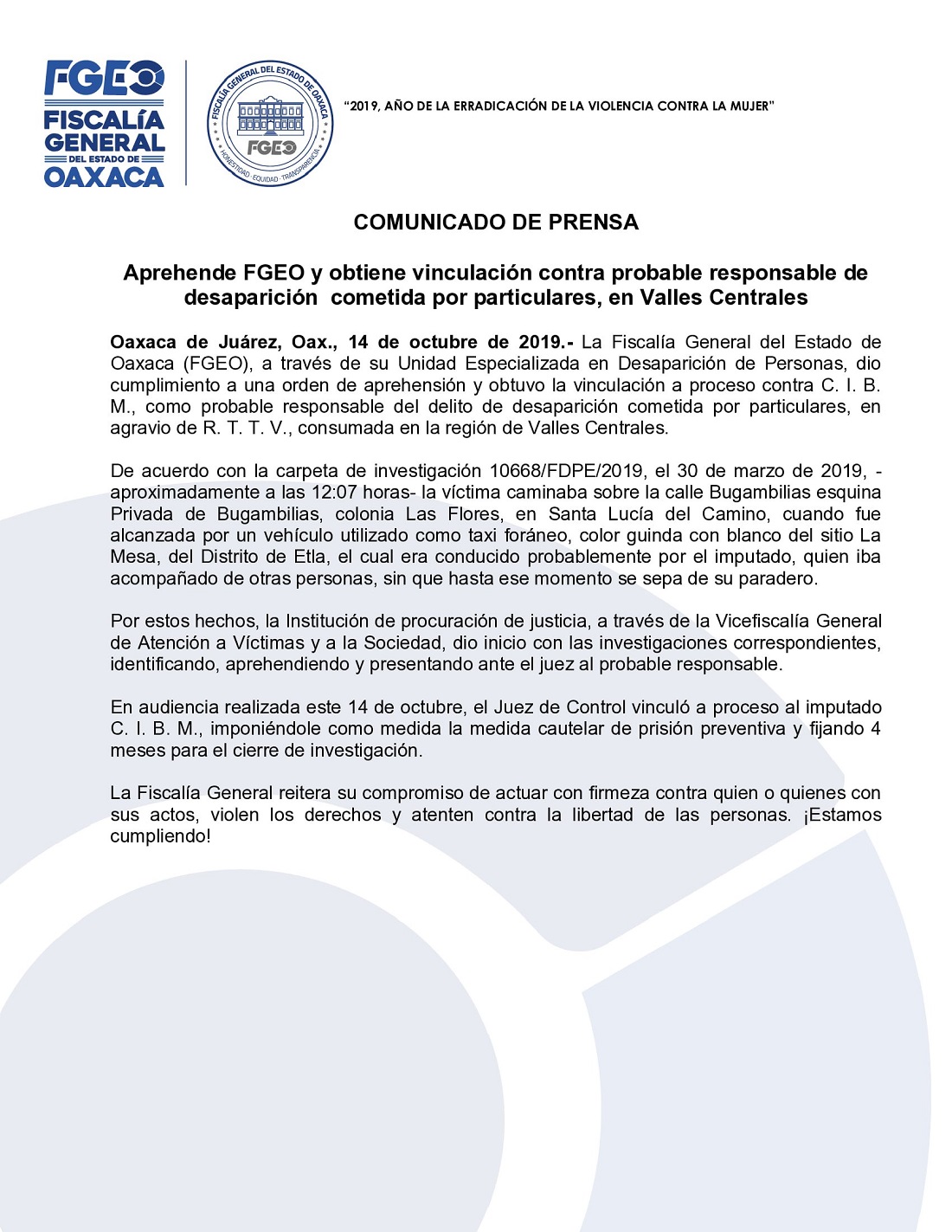 La Fiscalía General del Estado de Oaxaca (FGEO), a través de su Unidad Especializada en Desaparición de Personas, dio cumplimiento a una orden de aprehensión y obtuvo la vinculación a proceso contra C. I. B. M., como probable responsable del delito de desaparición cometida por particulares, en agravio de R. T. T. V., consumada en la región de Valles Centrales.