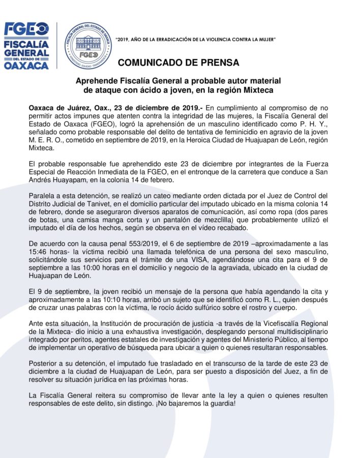 En cumplimiento al compromiso de no permitir actos impunes que atenten contra la integridad de las mujeres, la Fiscalía General del Estado de Oaxaca (FGEO), logró la aprehensión de un masculino identificado como P. H. Y., señalado como probable responsable del delito de tentativa de feminicidio en agravio de la joven M. E. R. O., cometido en septiembre de 2019, en la Heroica Ciudad de Huajuapan de León, región Mixteca.