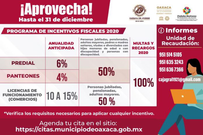 El Ayuntamiento de Oaxaca de Juárez invita a las y los contribuyentes capitalinos a aprovechar los descuentos establecidos en el Programa de Incentivos Fiscales 2020, vigentes hasta el 31 de diciembre.
