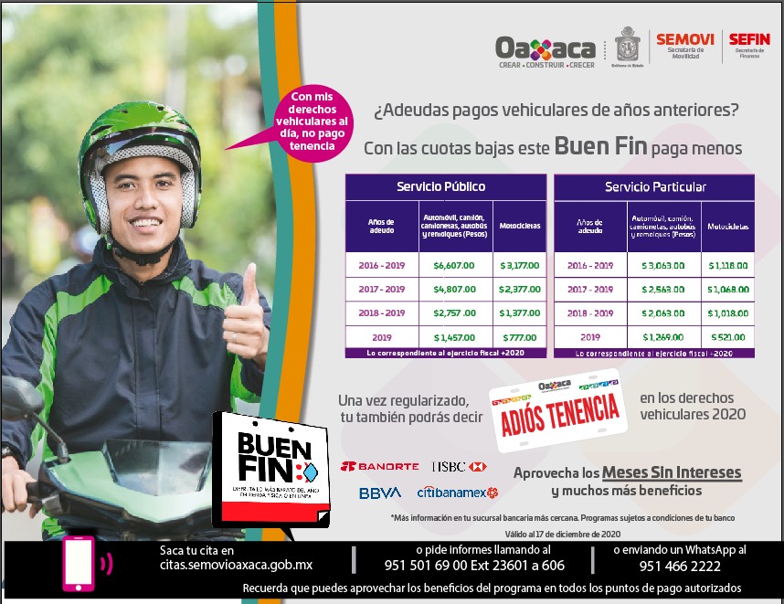 Además, como parte del programa “Buen Fin”, las y los usuarios de las diferentes instituciones bancarias, pueden aprovechar las promociones que ofrecen a meses sin intereses pagando en las ventanillas de Banorte, HSBC, BBVA y Citibanamex, para ello deben consultar las políticas y condiciones vigentes de cada banco.