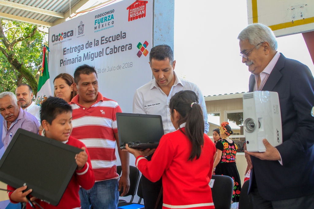 Durante el evento simbólico realizado en la Escuela Primaria “Miguel Cabrera” de este municipio, el mandatario estatal fue testigo de la entrega que realizaron el Director General de la Distribuidora de Automóviles y de la Fundación Distribuidores Nissan A.C., Carlos Escoto y la Directora Ejecutiva del Fideicomiso Fuerza México, Alejandra Kuri; de esta institución, así como de otros tres centros educativos que se ubican en los municipios de San Pedro Pochutla, San Miguel del Puerto y Eloxochitlán de Flores Magón.