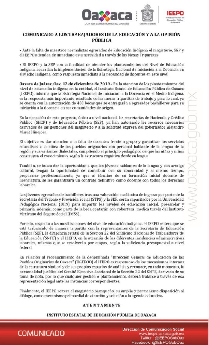 Finalmente, el IEEPO reitera al magisterio oaxaqueño, su amplia y permanente disposición al diálogo, como mecanismo primordial de atención y solución a la agenda educativa.