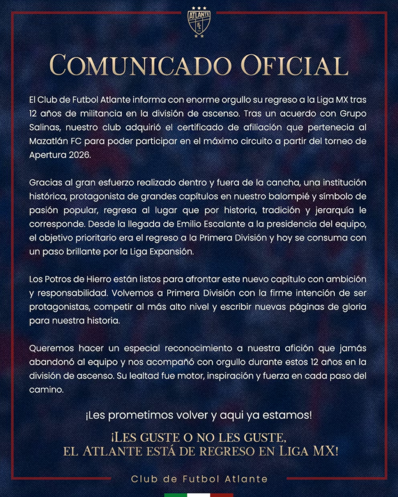 El regreso de Atlante a la Liga MX ya tiene fecha definida en el calendario futbolístico mexicano. El club azulgrana reaparecerá en la Primera División durante el torneo Apertura 2026, después de concretar la compra del certificado de afiliación de Mazatlán FC y contar con la aprobación de la Asamblea de Dueños de la Federación Mexicana de Futbol en diciembre de 2025.
