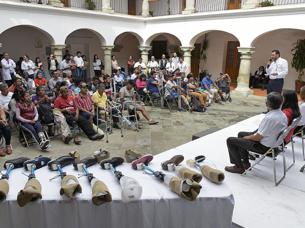 El secretario de Salud de Oaxaca, Donato Casas Escamilla encabezó la entrega de 20 prótesis transfemorales -por arriba de la rodilla- y 12 transtibiales-por debajo de la rodilla-, en beneficio de 31 personas de 22 municipios de la entidad.