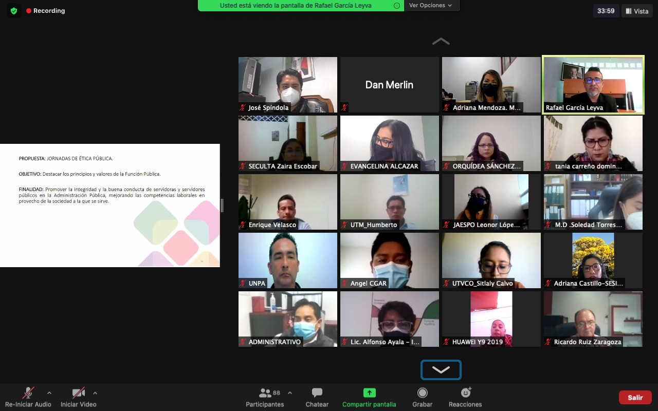 De esta manera, la Secretaría de la Contraloría, a través de su Subsecretaría de Contraloría Social y Transparencia, arrancó este 19 de febrero, la primera capacitación virtual del año en materia de ética, denominada: “Bases Generales de Ética en la función Pública”, a través de la cual se capacitó de manera virtual a 96 dependencias y entidades del Poder Ejecutivo del Estado.
