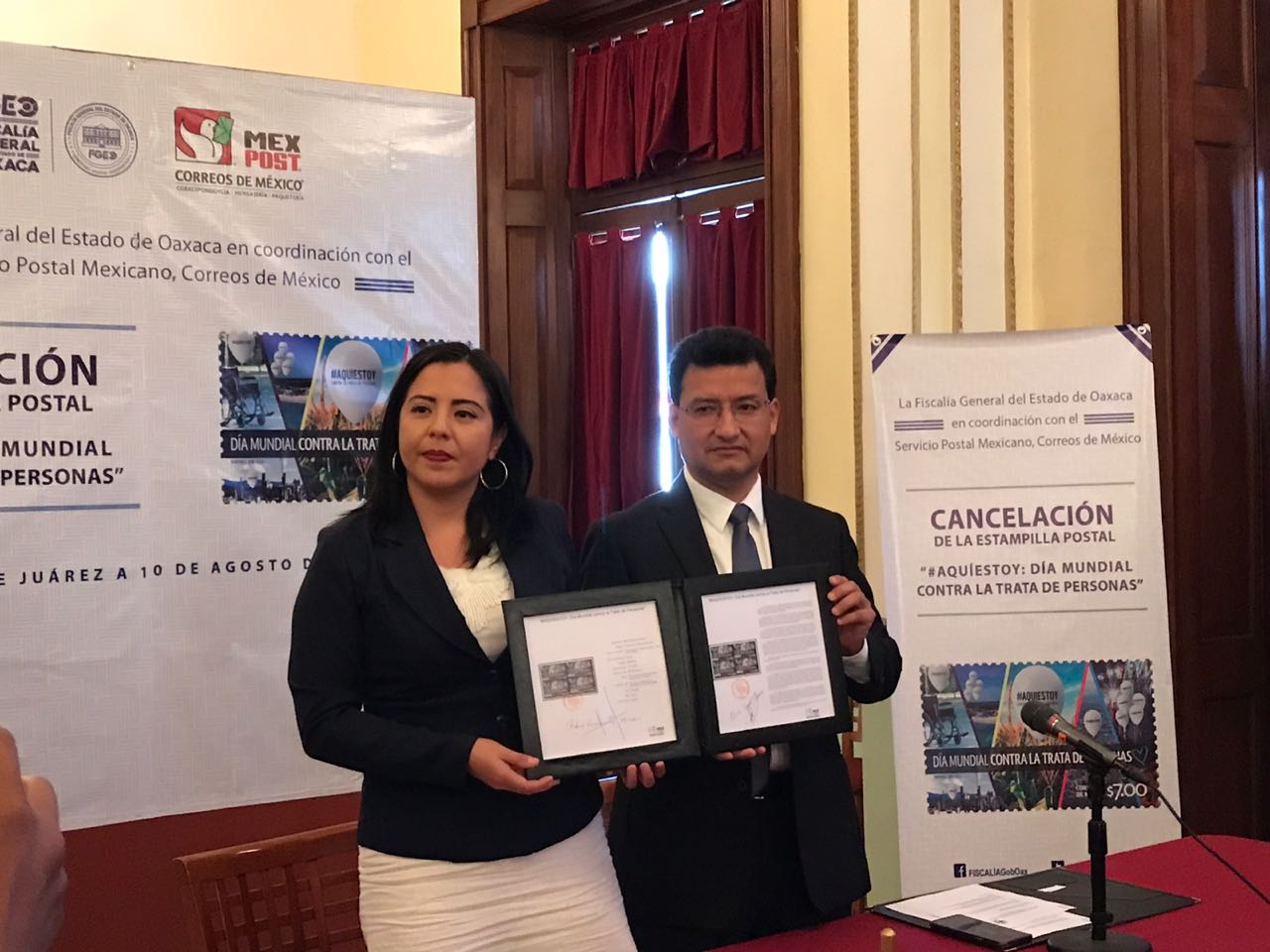 La Fiscalía General del Estado de Oaxaca, en coordinación con Correos de México, realizan la ceremonia de cancelación de la estampilla postal denominada “#AquíEstoy: Día Mundial Contra la Trata de Personas”.