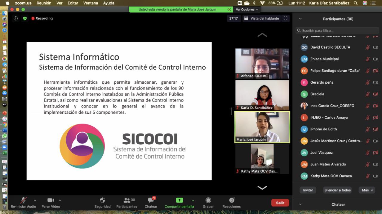 Díaz Navarro explicó que es a través del Sicocoi, como la Secretaría incentivó a dependencias, entidades, órganos auxiliares y desconcentrados de la Administración Pública Estatal, a realizar el proceso de evaluación de su Sistema de Control Interno Institucional, esta capacitación se realizó los días 14, 17, 22, 25, 30 de septiembre y 5 de octubre del presente año en un total de seis sesiones.