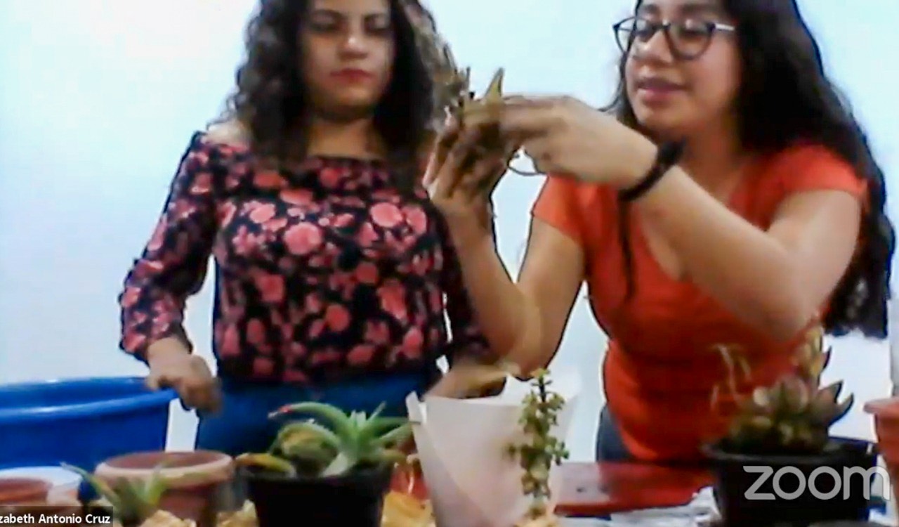 Mediante una enseñanza virtual, las biólogas Elizabeth Antonio Cruz y Miriam Robles Benítez, compartieron las técnicas de fabricación de contenedores orgánicos y kokedamas a base de materiales reciclados, los cuales brindan beneficios al crecimiento de las plantas.