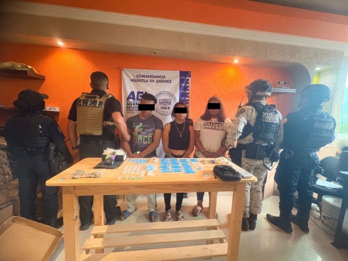 Resultado de acciones operativas en la región Sierra de Flores Magón, la Fiscalía General del Estado de Oaxaca (FGEO) ejecutó una orden de cateo que permitió la identificación de un punto de venta de drogas donde se logró la detención de tres personas, un hombre identificado como J.I.G.C., así como dos mujeres: G.N.G.C. y C.L.O.F., además del aseguramiento de diversas dosis de droga.