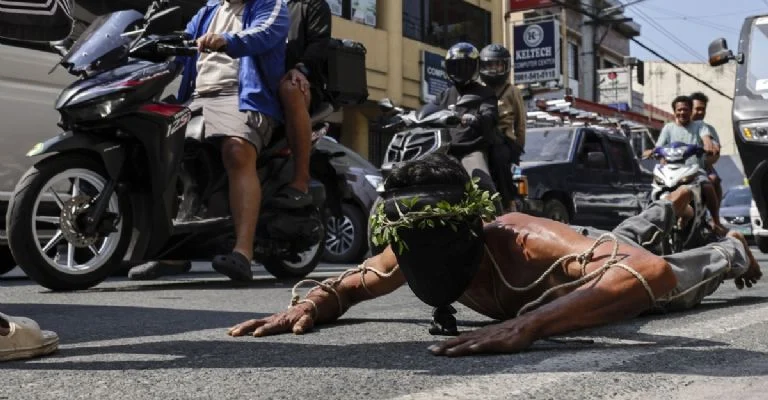 Pero este jueves 2 de abril, más que amor al prójimo o atención al mandamiento de humildad, servicio y caridad, por las calles de la ciudad de San Fernando, en la provincia de Pampanga, se observan escenas de autoflagelación y a penitentes portando grandes cruces.