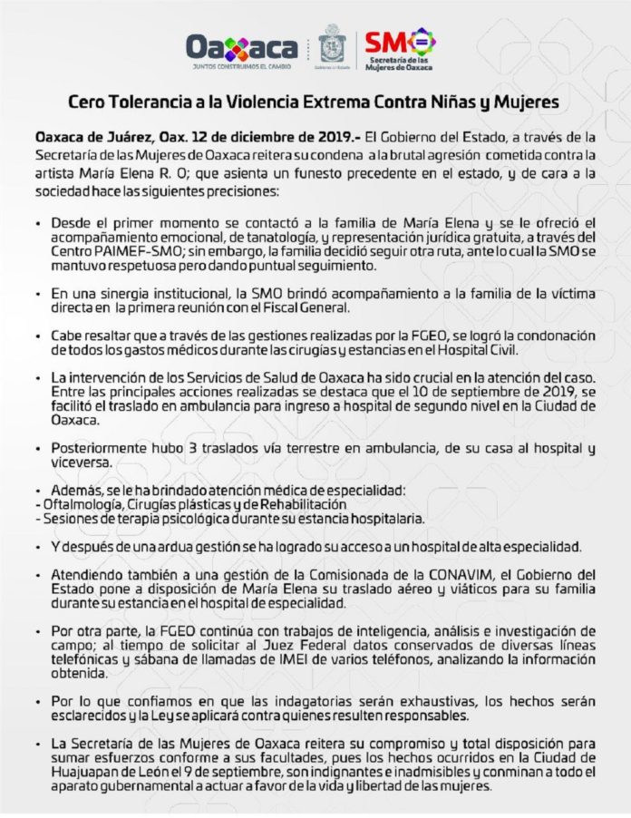 El Gobierno del Estado, a través de la Secretaría de las Mujeres de Oaxaca (SMO), reitera su condena a la brutal agresión cometida contra la artista María Elena R. O; que asienta un funesto precedente en el estado, y de cara a la sociedad hace las siguientes precisiones: