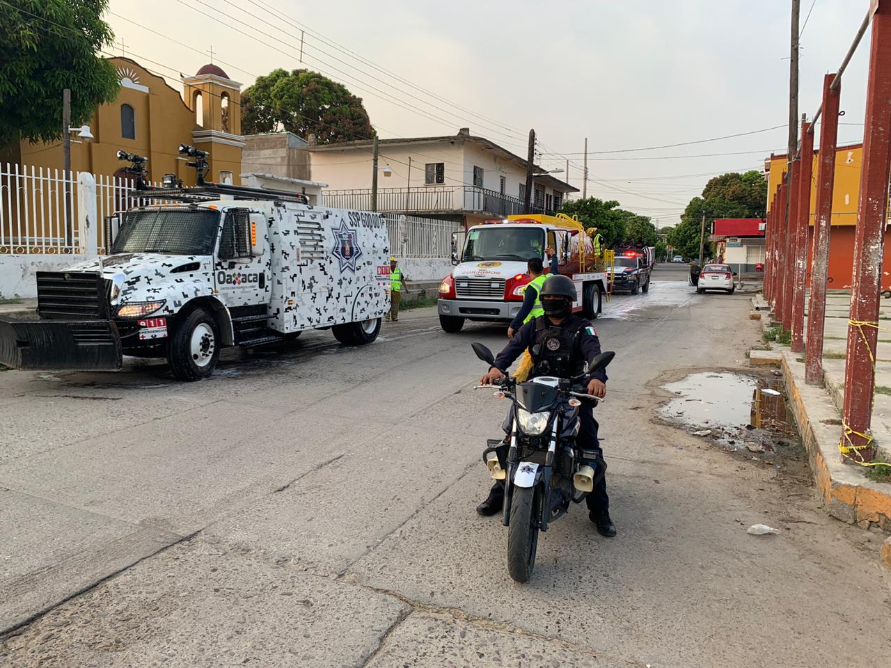 Durante las primeras horas de este lunes, personal del Heroico Cuerpo de Bomberos de Oaxaca (HCBO), Policía Vial Estatal y Policía Estatal, sanitizaron las calles y espacios públicos de mayor concentración de personas.