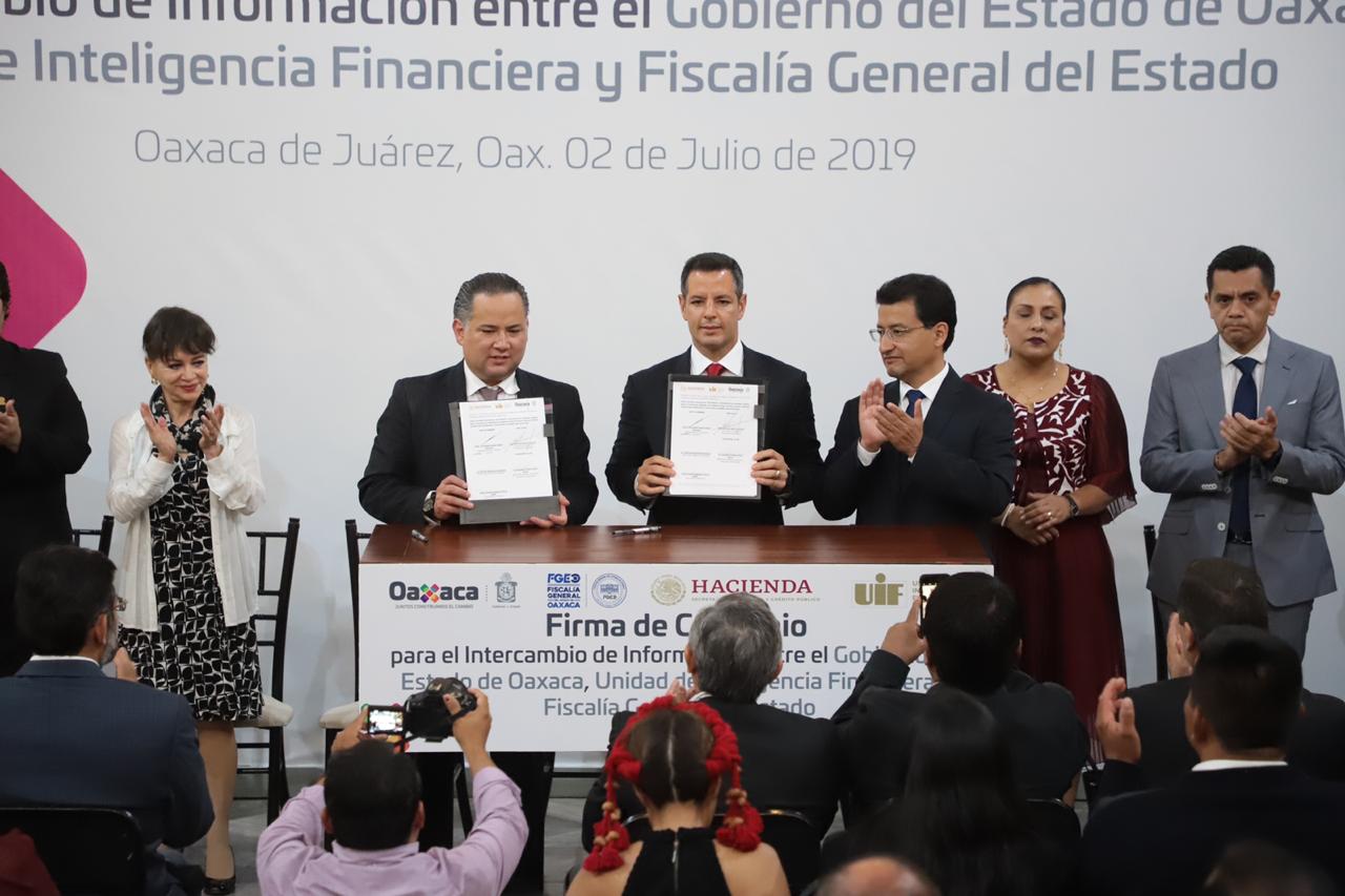 En este mismo acto, el gobernador Alejandro Murat atestiguó la firma del convenio de colaboración para el intercambio de información entre la Fiscalía General del Estado de Oaxaca (FGEO) y esta misma Unidad de Inteligencia Financiera.