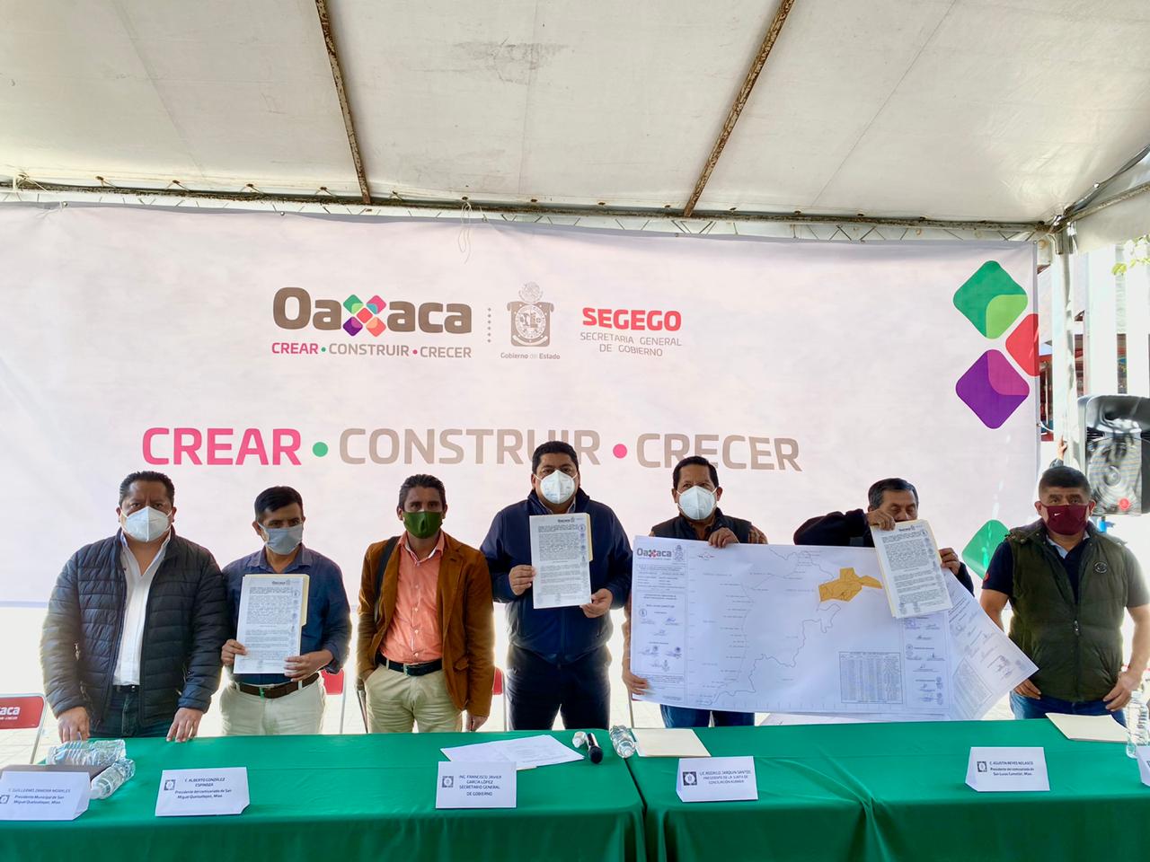La Secretaría General de Gobierno (Segego), a través de la Junta de Conciliación Agraria, junto con los presidentes municipales y de núcleos agrarios de San Miguel Quetzaltepec y San Lucas Camotlán, firmaron este día un convenio definitivo en la línea de colindancia que abarca más de cinco kilómetros, esto como parte de la conciliación en la indefinición de la zona de controversia entre ambas comunidades.