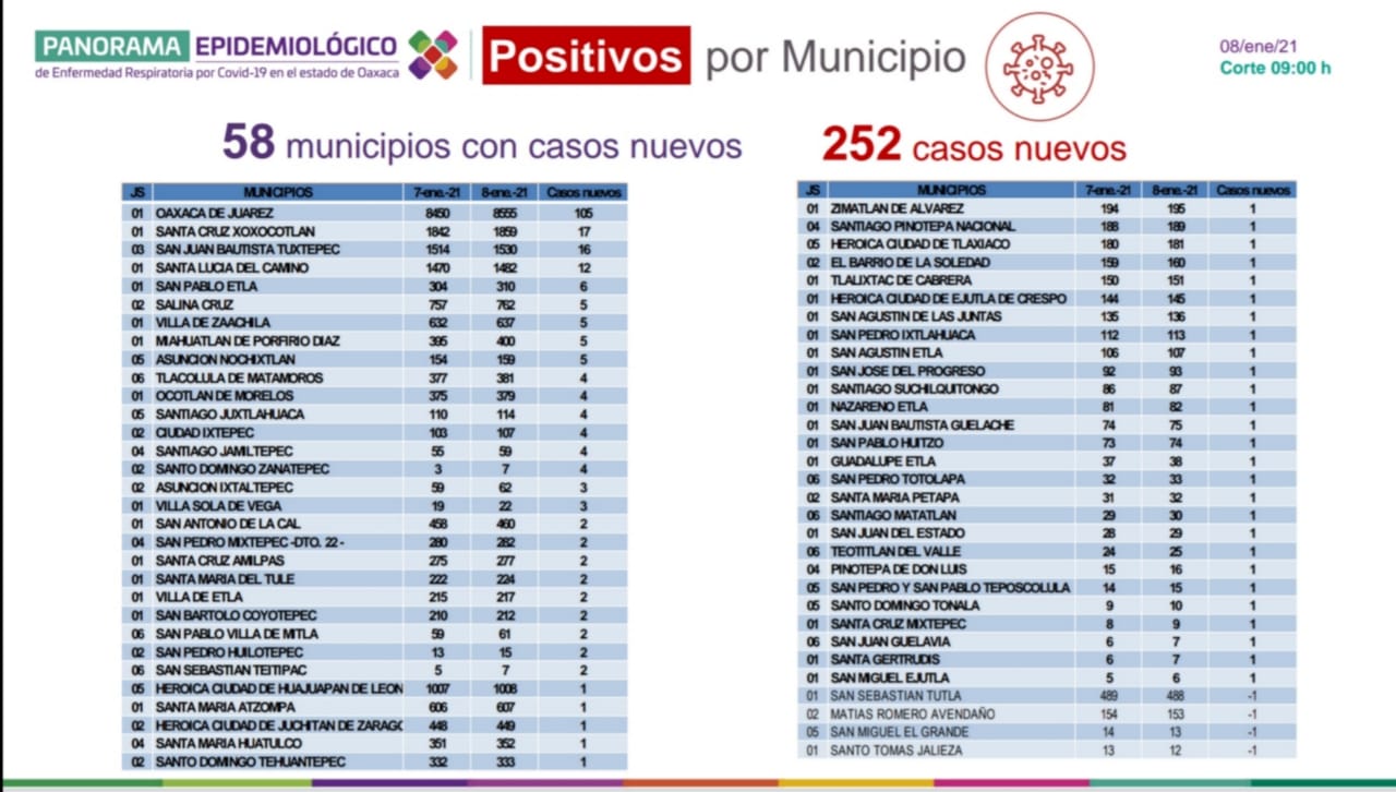 Precisó que este viernes se reportaron 58 ayuntamientos con casos nuevos, dentro de los que destacan: Oaxaca de Juárez con 105, Santa Cruz Xoxocotlán con 17, San Juan Bautista Tuxtepec con 16 y Santa Lucía de Camino con 12, por mencionar algunos.