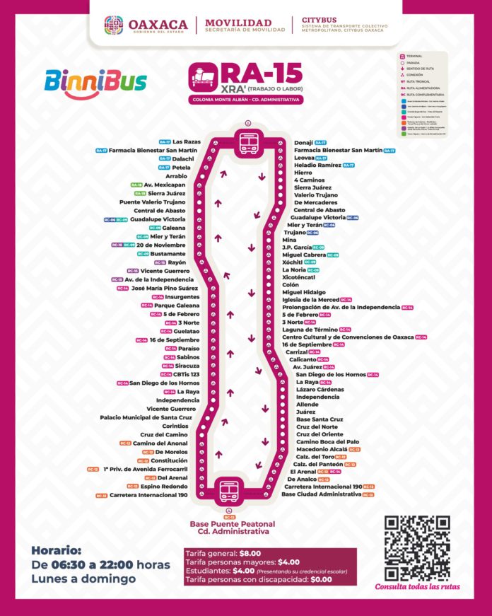 El Sistema de Transporte Colectivo Metropolitano BinniBus Oaxaca inició la operación de la ruta RA-15, la cual conecta a la colonia Monte Albán con Ciudad Administrativa.