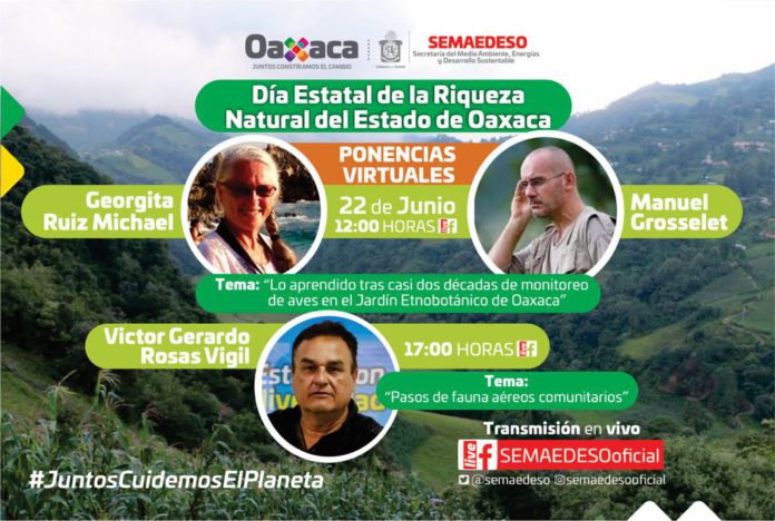 En el marco del Día de la Riqueza Natural del Estado de Oaxaca a celebrarse este lunes de 22 de junio, la Secretaría del Medio Ambiente, Energías y Desarrollo Sustentable (Semaedeso), transmitirá dos ponencias de manera virtual, con el fin de difundir las acciones de conservación de la biodiversidad impulsadas en la entidad.