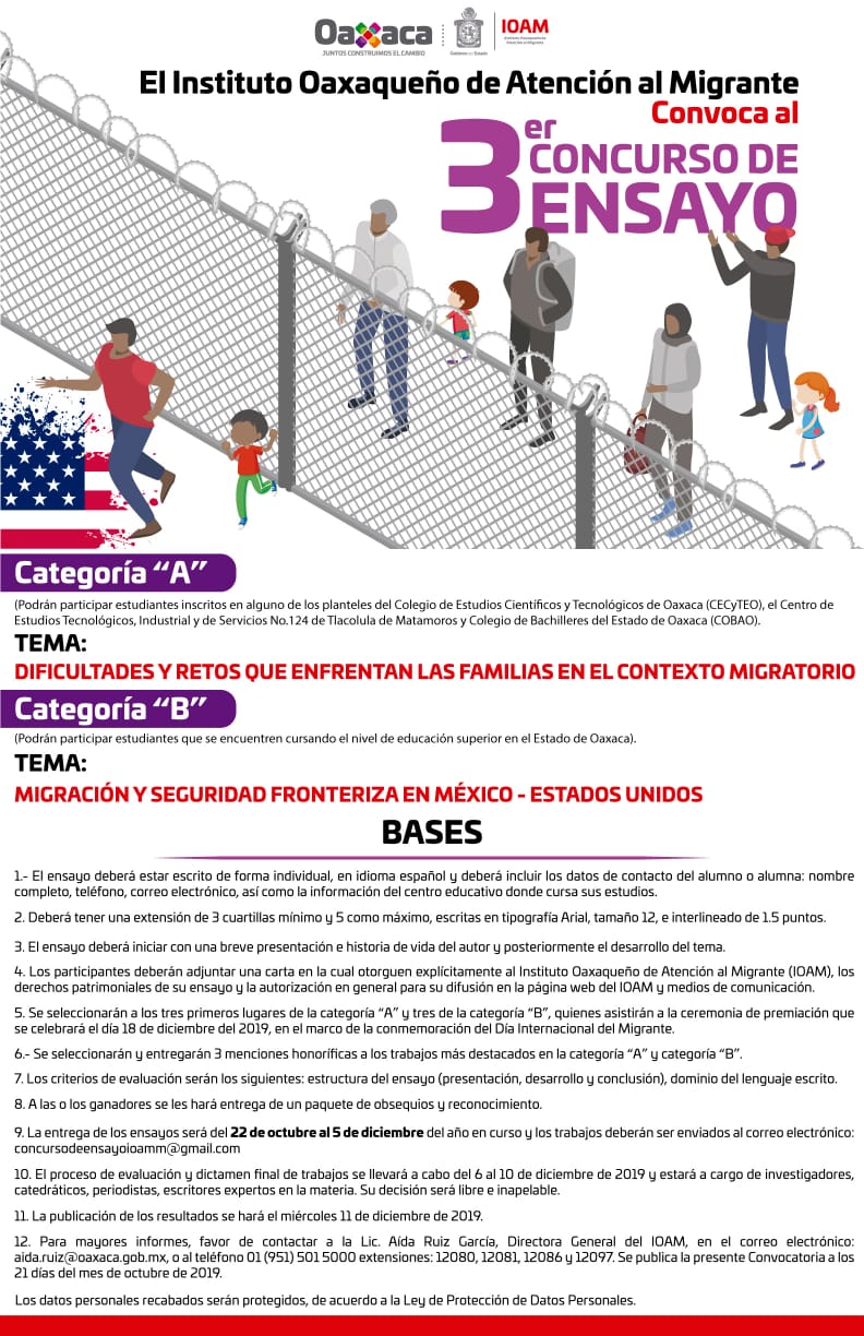 Por tercer año consecutivo, el Gobierno del Estado a través del Instituto Oaxaqueño de Atención al Migrante (IOAM) lanza la convocatoria del concurso de ensayo sobre migración, con la finalidad de conocer cómo es concebido este fenómeno, así como su impacto en el entorno social de las y los jóvenes oaxaqueños.