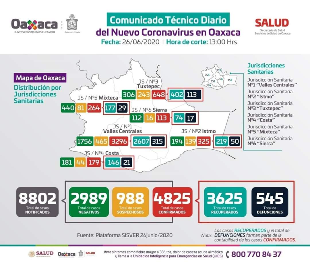 Valles Centrales es la región más afectada por la pandemia de COVID-19, hasta el corte de hoy 26 de junio, se ha registrado en esta zona tres mil 296 contagios, es decir, el 68.3% de los cuatro mil 825 acumulados en todo el territorio oaxaqueño.