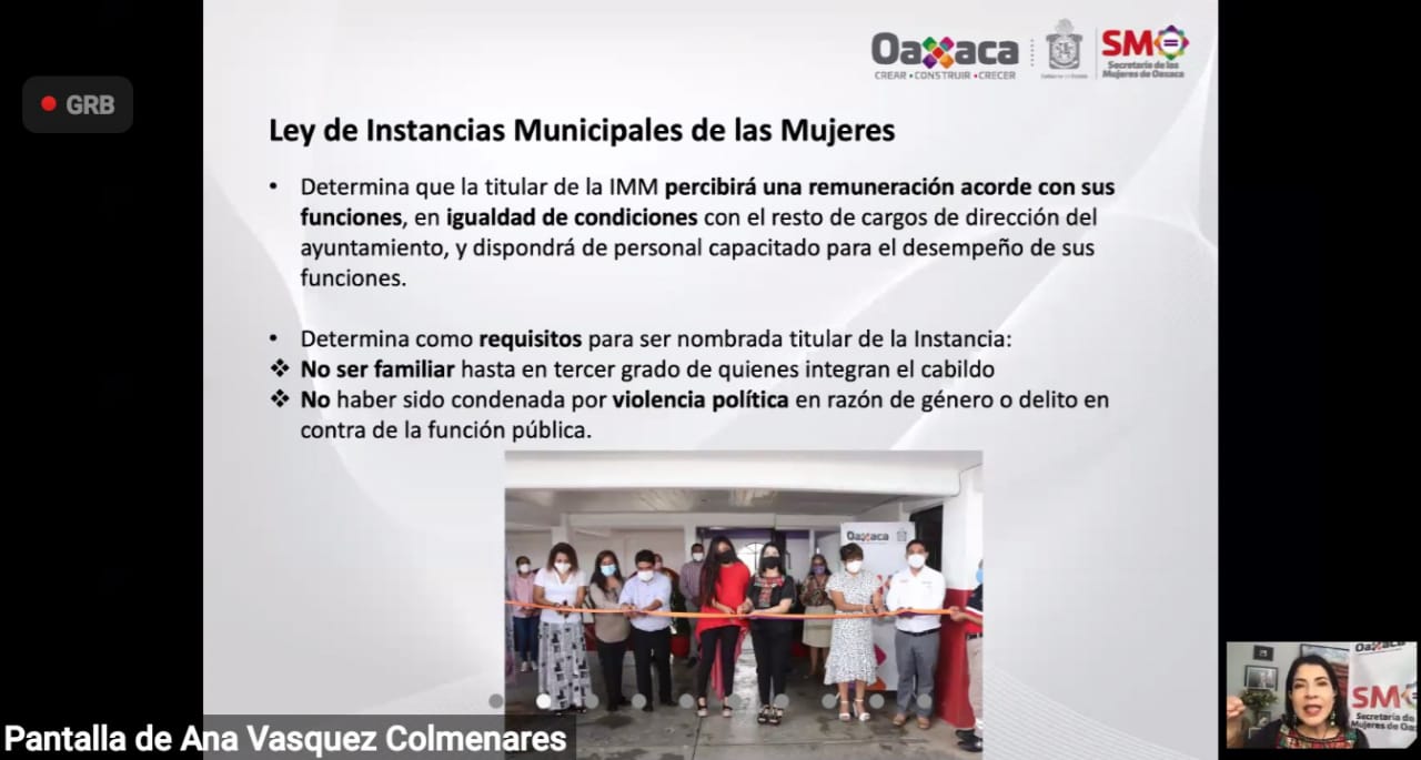 La SMO describió durante la capacitación en línea, ante munícipes de 60 Ayuntamientos, los requisitos establecidos en la Ley para nombrar a la titular de la IMM, como no ser familiar hasta en tercer grado de quienes integran el cabildo, no haber sido condenada por violencia política en razón de género o delito en contra de la función pública.