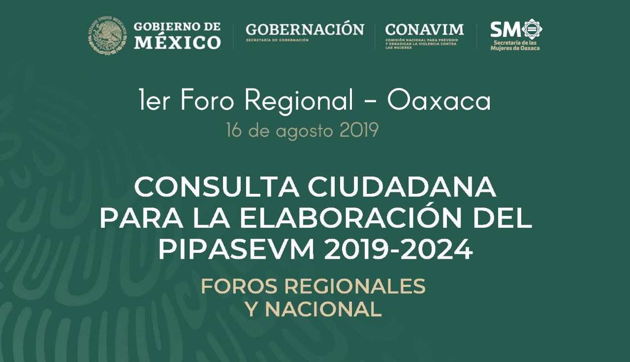Como parte del compromiso institucional de garantizar el derecho de las mujeres a una vida libre de violencia, se convoca a participar en los Foros de Consulta Ciudadana que se desarrollarán para elaborar el Programa Integral para Prevenir, Atender, Sancionar y Erradicar la Violencia contra las Mujeres (PIPASEVM) 2019-2024.