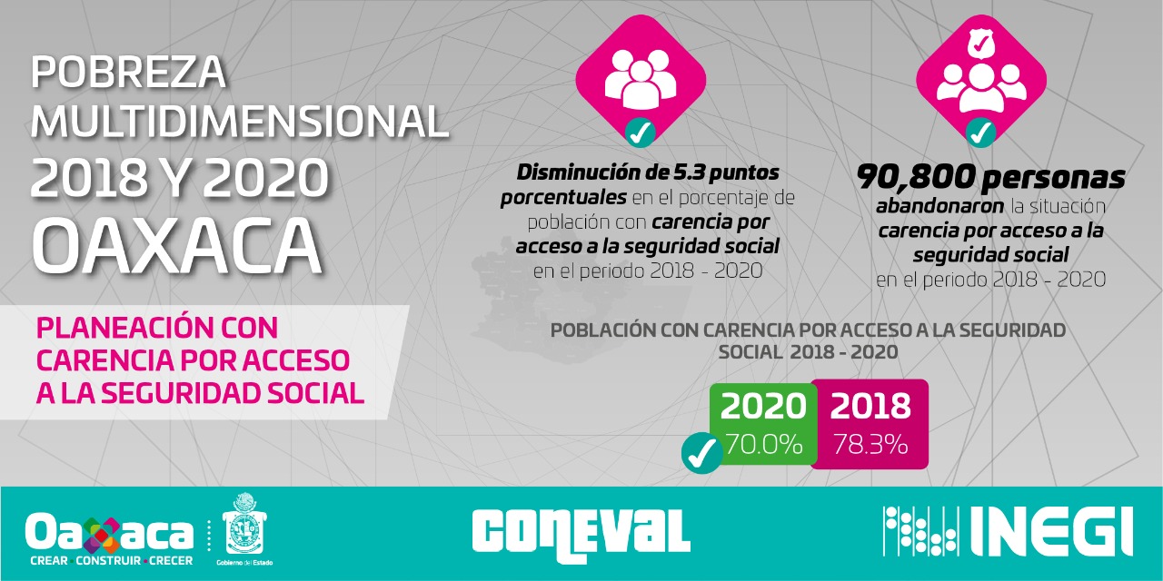 Asimismo, el secretario de Bienestar, Rubén Vasconcelos Méndez, agregó que los resultados presentados por el Coneval señalan que, entre 2018 y 2020, Oaxaca continuó con el avance significativo en la disminución de 3 carencias sociales: acceso a la seguridad social, calidad y espacios de la vivienda y acceso a los servicios básicos.