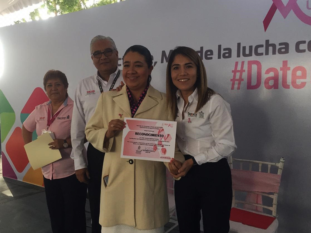 Se entregaron reconocimientos a los coordinadores jurisdiccionales del programa de Cáncer de Mama, Susana Martínez Julián, de Valles Centrales; Margarita Aquino, de la Mixteca, Noel Ruiz, de la Sierra, así como al personal de los Centros de Salud de San Isidro Monjas, Tlalixtac de Cabrera y Pueblo Nuevo, por su dedicación y esfuerzo para combatir la enfermedad.