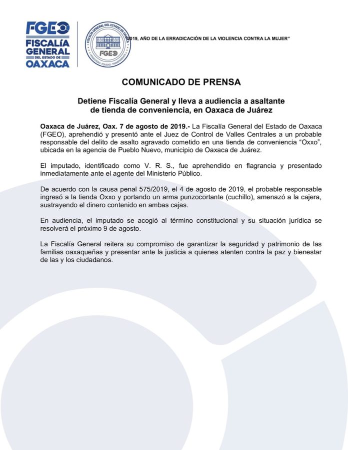La Fiscalía General del Estado de Oaxaca (FGEO), aprehendió y presentó ante el Juez de Control de Valles Centrales a un probable responsable del delito de asalto agravado cometido en una tienda de conveniencia “Oxxo”, ubicada en la agencia de Pueblo Nuevo, municipio de Oaxaca de Juárez.