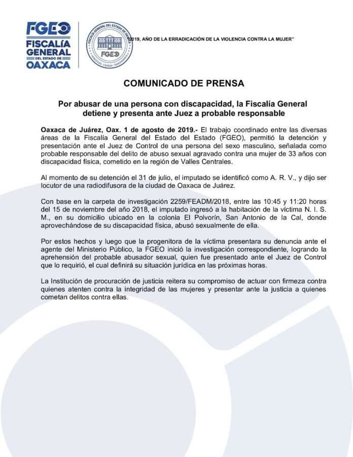 El trabajo coordinado entre las diversas áreas de la Fiscalía General del Estado del Estado (FGEO), permitió la detención y presentación ante el Juez de Control de una persona del sexo masculino, señalada como probable responsable del delito de abuso sexual agravado contra una mujer de 33 años con discapacidad física, cometido en la región de Valles Centrales.