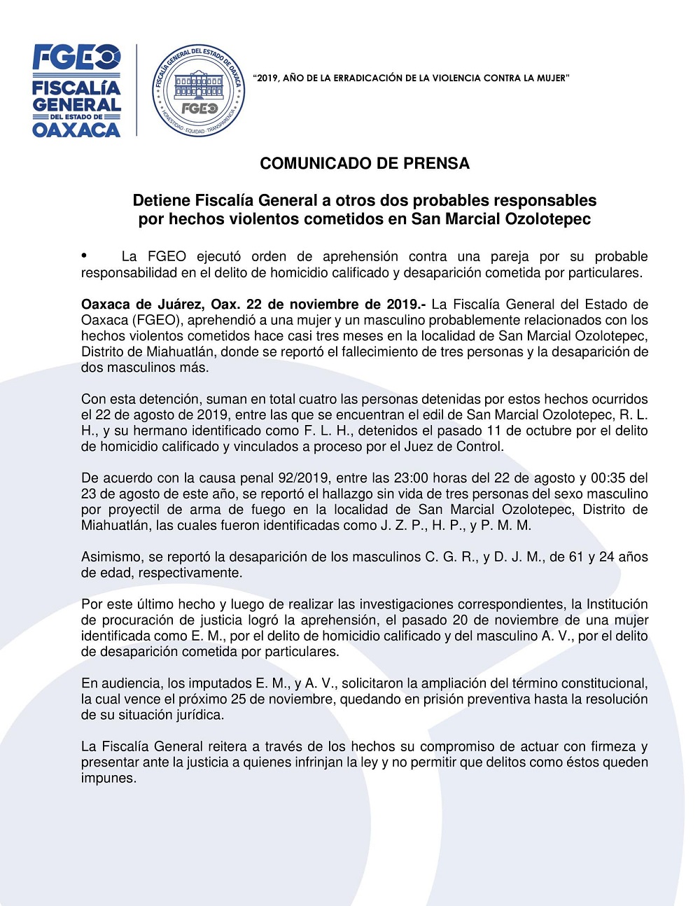 Con esta detención, suman en total cuatro las personas detenidas por estos hechos ocurridos el 22 de agosto de 2019, entre las que se encuentran el edil de San Marcial Ozolotepec, R. L. H., y su hermano identificado como F. L. H., detenidos el pasado 11 de octubre por el delito de homicidio calificado y vinculados a proceso por el Juez de Control.