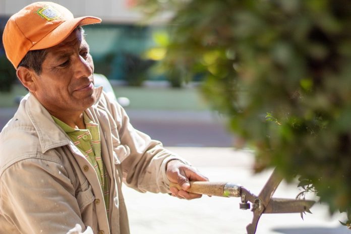 Don Enrique Ramírez Cruz lleva ocho años realizando esta labor, desde las primeras horas del día comienza la tarea; tijeras en mano convierte un arbusto de adelfa y eugenia, en una obra de arte que transmite alegría y otorga vida a los edificios.