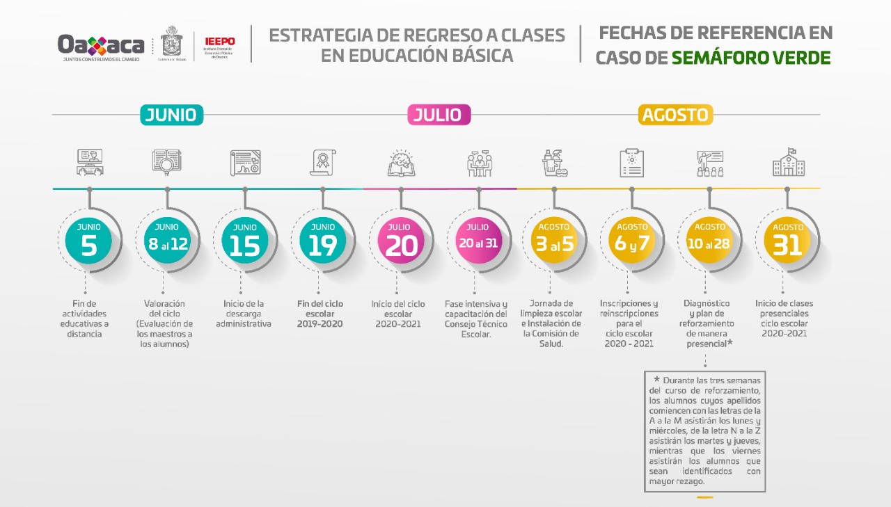 El 10 de agosto es la fecha referencial para el posible regreso a las clases presenciales en educación básica en México, siempre y cuando el semáforo sanitario establecido esté ya en verde. En lo que corresponde a Oaxaca se tomarán en cuenta también las opiniones de todos los actores educativos en las regiones y municipios, que en su mayoría se rigen por sus usos y costumbres.