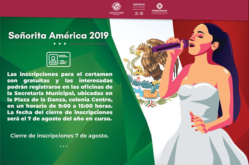 Este miércoles 7 de agosto, a las 15:00 horas, finalizará el periodo de inscripción de las mujeres capitalinas interesadas en participar en el certamen de selección de la “Señorita América 2019”, por lo que deberán acercarse a las oficinas de la Secretaría del Ayuntamiento ubicadas en el Palacio Municipal para realizar este proceso.