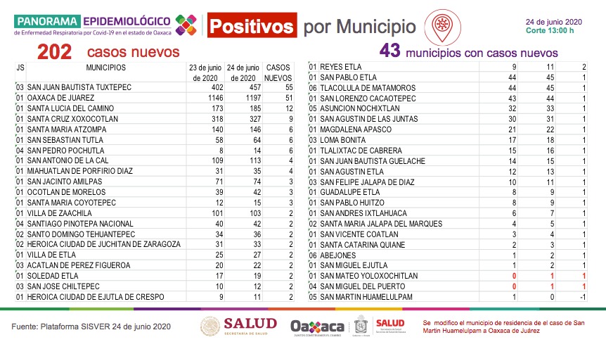 Oaxaca llegó a los cuatro mil 426 positivos de COVID-19, al registrar este miércoles 24 de junio, 202 casos nuevos de la enfermedad; también suma 510 fallecimientos, 14 más que el día de ayer.