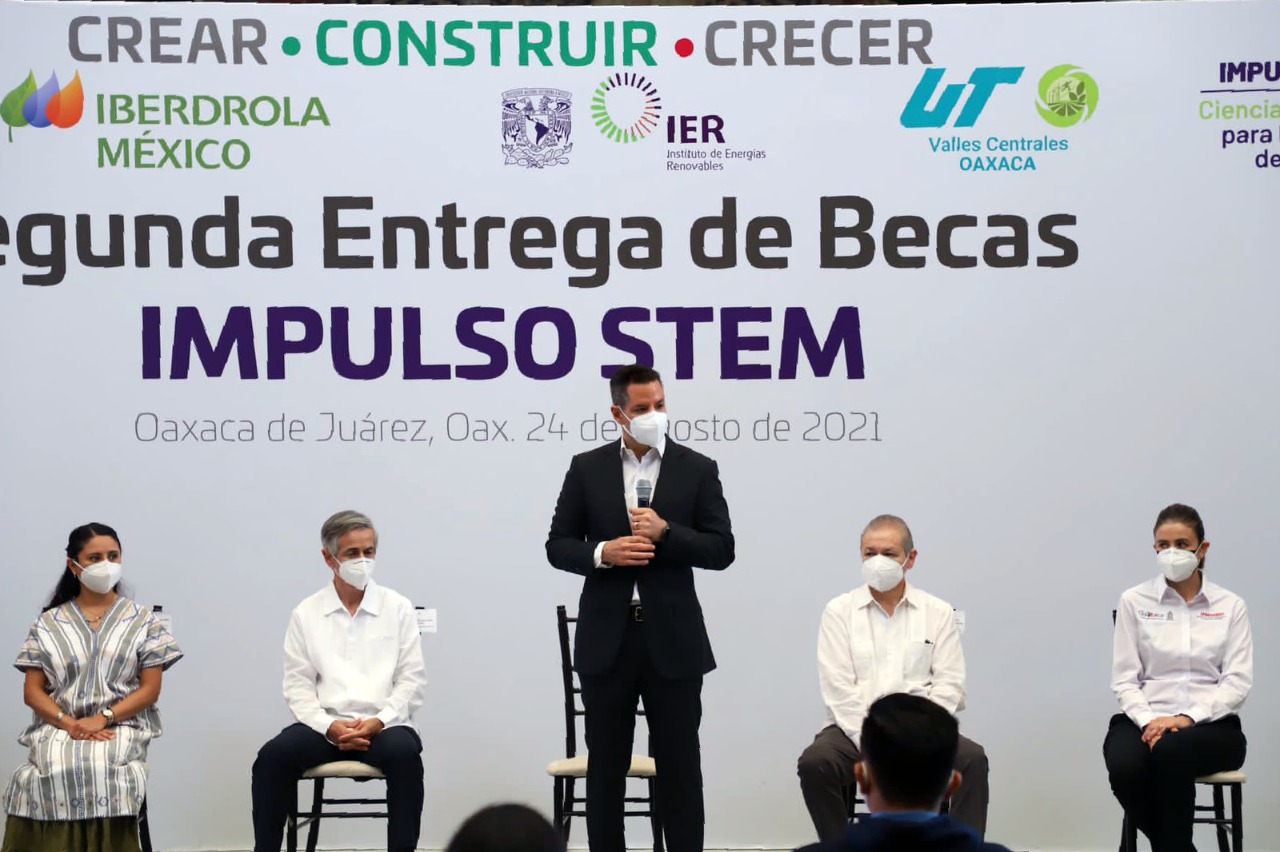 Iberdrola México y el Gobierno de Oaxaca entregaron hoy 20 becas con motivo de la segunda edición de Impulso STEM, un programa realizado en alianza con la Universidad Tecnológica de los Valles Centrales de Oaxaca (UTVCO) y el Instituto de Energías Renovables de la UNAM (IER), cuyo objetivo es promover la formación de los jóvenes, especialmente mujeres, en ciencia, tecnología, ingeniería y matemáticas (STEM, por sus siglas en inglés).
