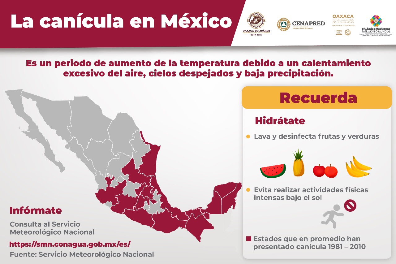 Con la finalidad de reducir afectaciones a la salud de la población por el incremento en la temperatura en el territorio oaxaqueño a causa del incipiente fenómeno meteorológico conocido como canícula, el Ayuntamiento de Oaxaca de Juárez, a través de la Subdirección de Protección Civil de la Dirección de Seguridad Pública, Vialidad y Protección Ciudadana, invita a la ciudadanía a seguir una serie de recomendaciones para evitar golpes de calor y enfermedades asociadas.