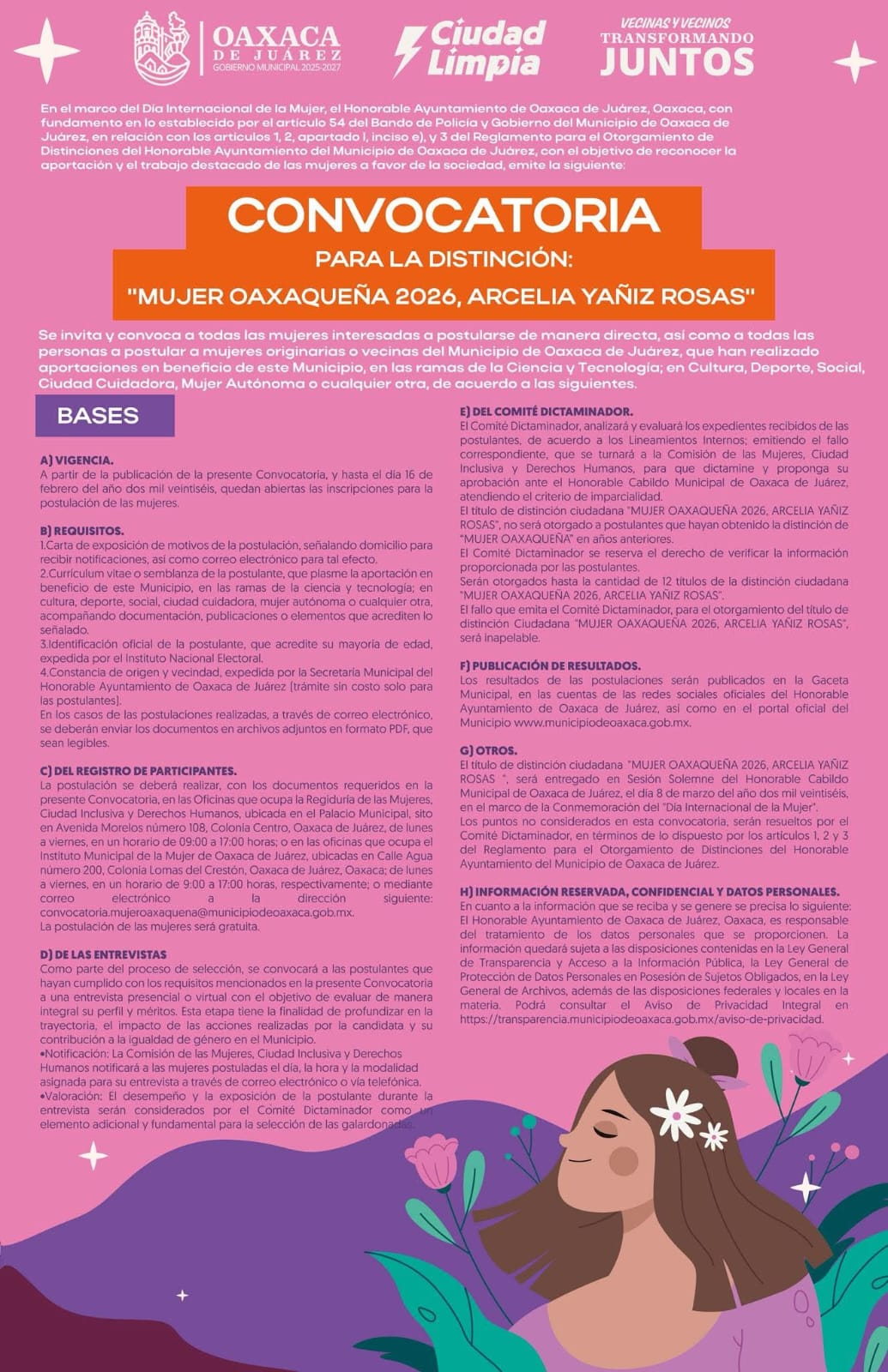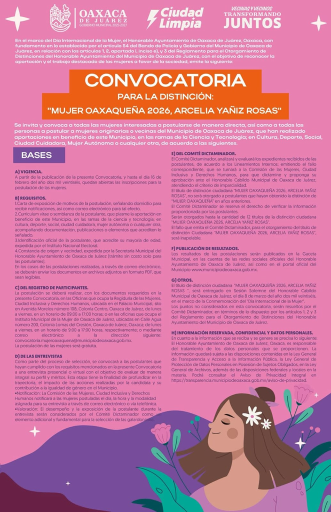 En el marco de la conmemoración del Día Internacional de la Mujer, el Honorable Ayuntamiento de Oaxaca de Juárez emitió la convocatoria para la distinción ciudadana “Mujer Oaxaqueña 2026, Arcelia Yañiz Rosas”, con el objetivo de reconocer la trayectoria, el esfuerzo y las contribuciones relevantes de mujeres originarias o vecinas del municipio en beneficio de la sociedad.