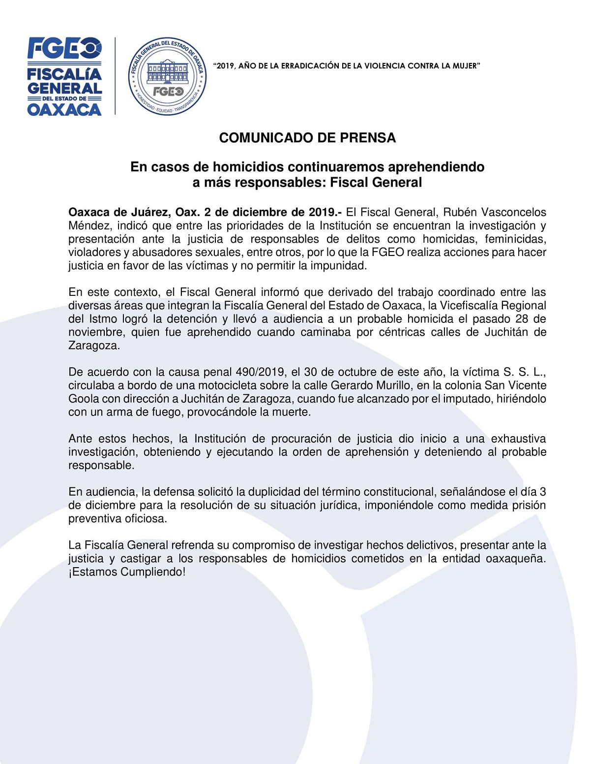 En este contexto, el Fiscal General informó que derivado del trabajo coordinado entre las diversas áreas que integran la Fiscalía General del Estado de Oaxaca, la Vicefiscalía Regional del Istmo logró la detención y llevó a audiencia a un probable homicida el pasado 28 de noviembre, quien fue aprehendido cuando caminaba por céntricas calles de Juchitán de Zaragoza.