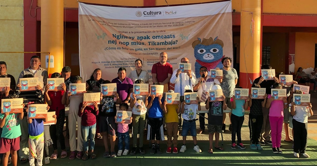 El primer evento se llevó a cabo en la explanada municipal de San Mateo del Mar, donde se entregó el texto bilingüe escrito en las lenguas Ombeayiüts y español, Ngineay apak omeaats nej nop miüs, Tikambaja? ¿Cómo es feliz un gato, en San Mateo del Mar?, resultado del trabajo creativo de Hugo Alberto Hidalgo Buenavista, autor de la obra y hablante de este idioma, junto con el ilustrador Aldo Hinojosa. También participó María Fernanda Ramírez Acevedo, quien colaboró en los gráficos.
