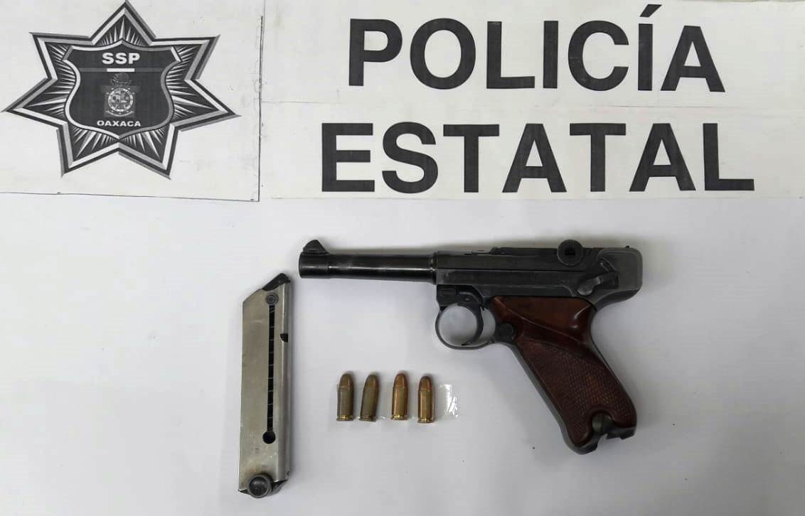 La intervención ocurrió durante los patrullajes de seguridad desplegados en Puerto Escondido, específicamente en la avenida Oaxaca del Sector Juárez, donde mediante una inspección preventiva, a dicha persona le fue asegurada un arma de fuego tipo pistola, calibre 7.65/.32, matrícula 110816 y un cargador metálico con cuatro cartuchos útiles del mismo calibre.