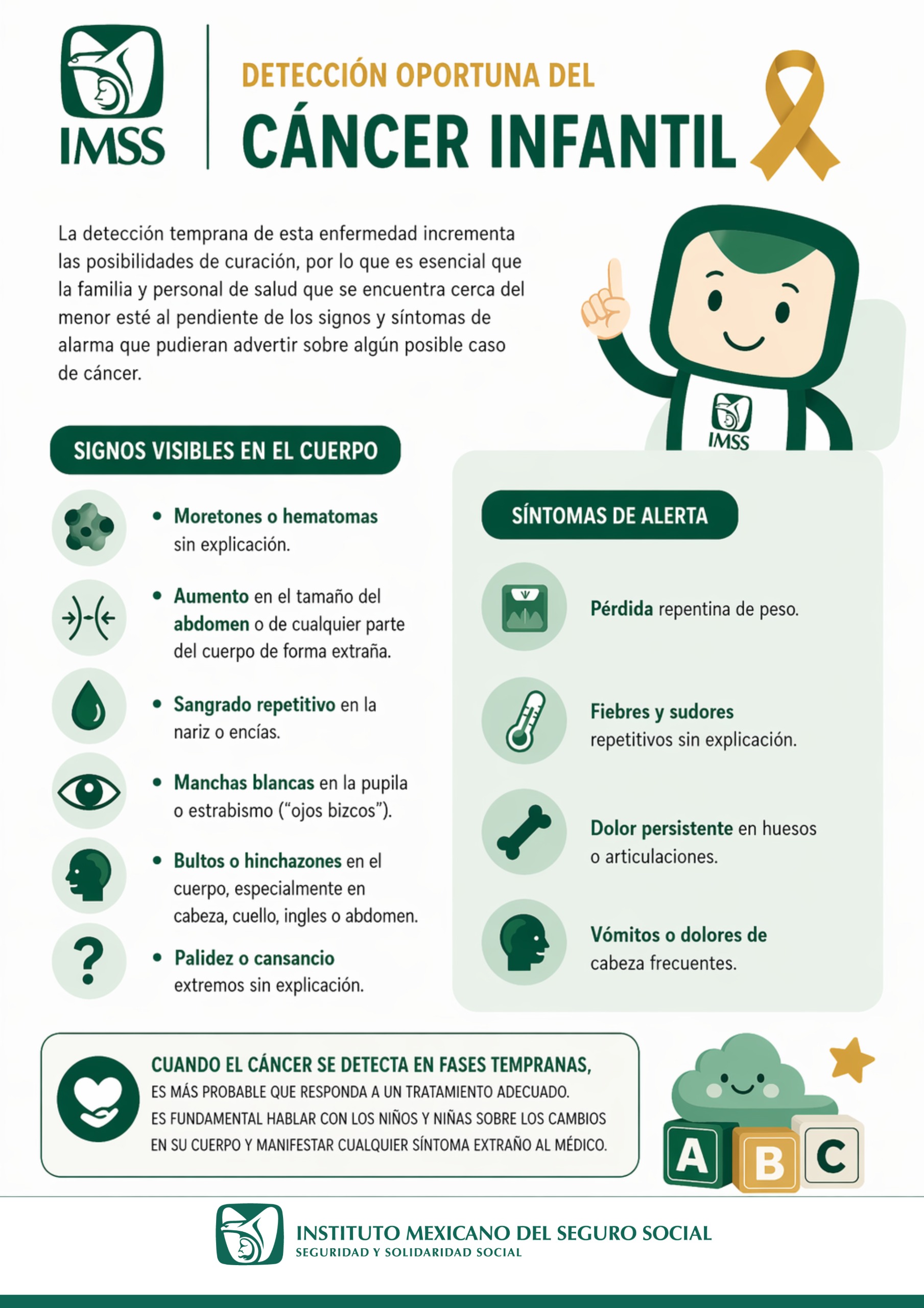 La oncóloga pediatra adscrita al Centro de Referencia Estatal para la Atención del Niño y de la Niña con Cáncer (OncoCREAN) del Hospital General de Zona (HGZ) No. 1, doctora Nalyn Lizeth Rodríguez Brindis afirmó que cuidar la salud infantil implica observar y actuar a tiempo ante cualquier cambio en el cuerpo, como moretones sin causa aparente, bolitas o inflamaciones, sangrados frecuentes, crecimiento inusual del abdomen, cambios en los ojos o cansancio extremo, son signos que requieren atención médica.