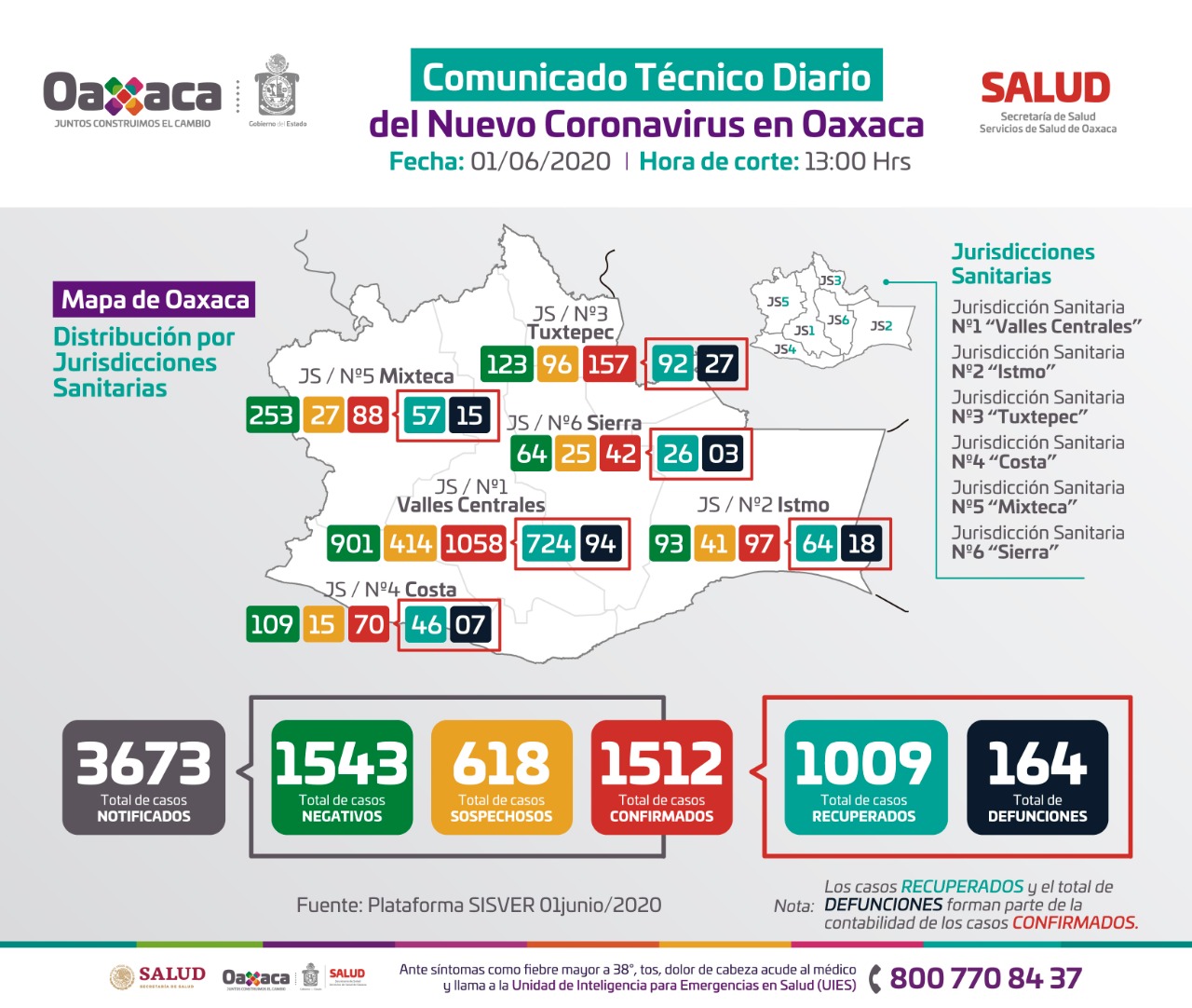 Agregó que en la Jurisdicción Sanitaria uno Valles Centrales hay mil 058 casos confirmados con 94 defunciones, Tuxtepec con 157 casos y 27 fallecimientos, el Istmo con 97 y 18 decesos, la Mixteca con 88 y 15 muertes, seguido de la Costa con 70 casos y siete decesos y la Sierra Norte con 42 y tres defunciones.