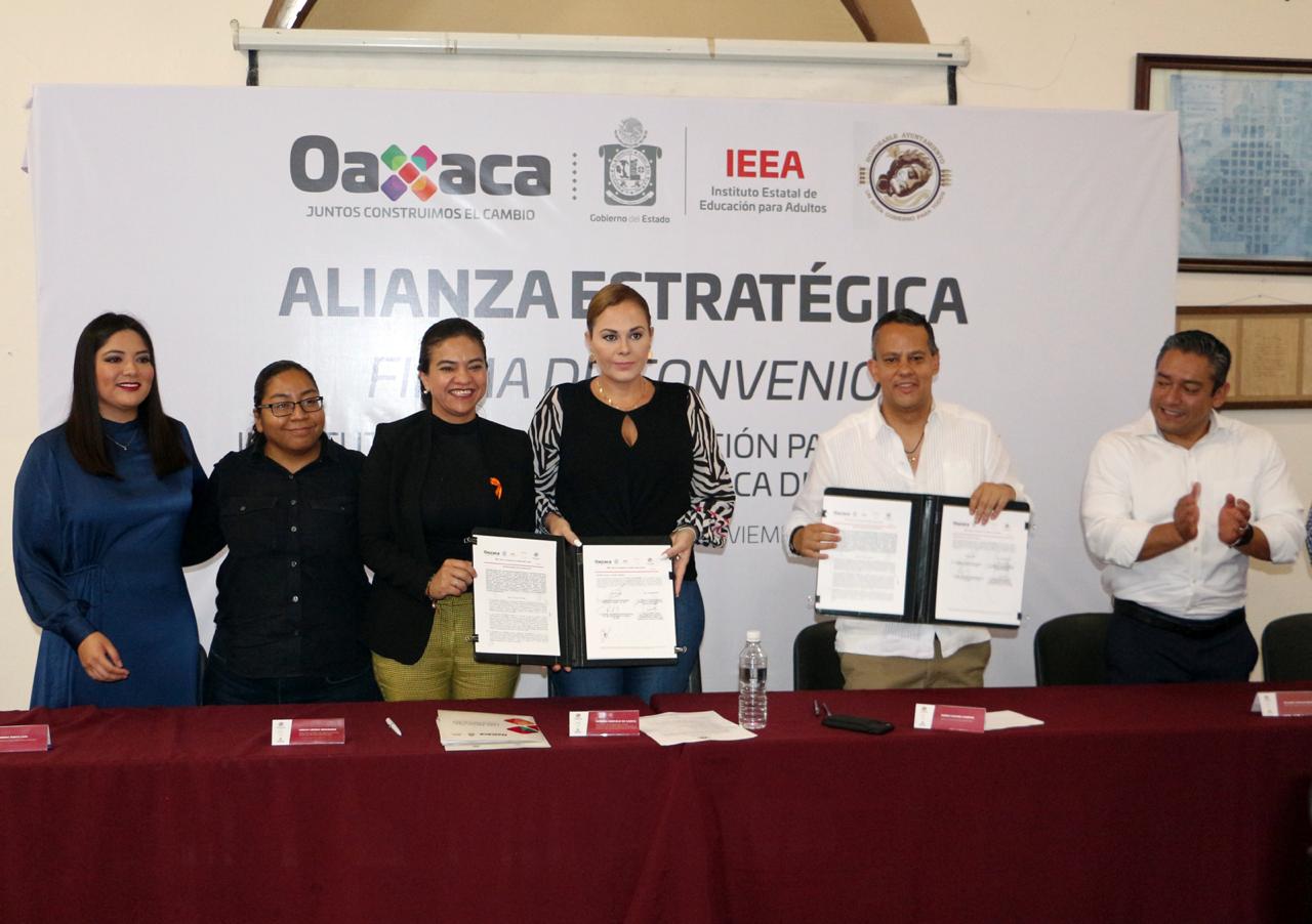 “Segura estoy que mediante esta firma de convenio concretamos y fortalecemos un lazo que nos une y una misión que nos pone día a día en este camino, abatir el rezago educativo y brindar a las y los oaxaqueños una herramienta de vida que les permitirá empoderarse dentro de sus propias familias y la sociedad”, resaltó.