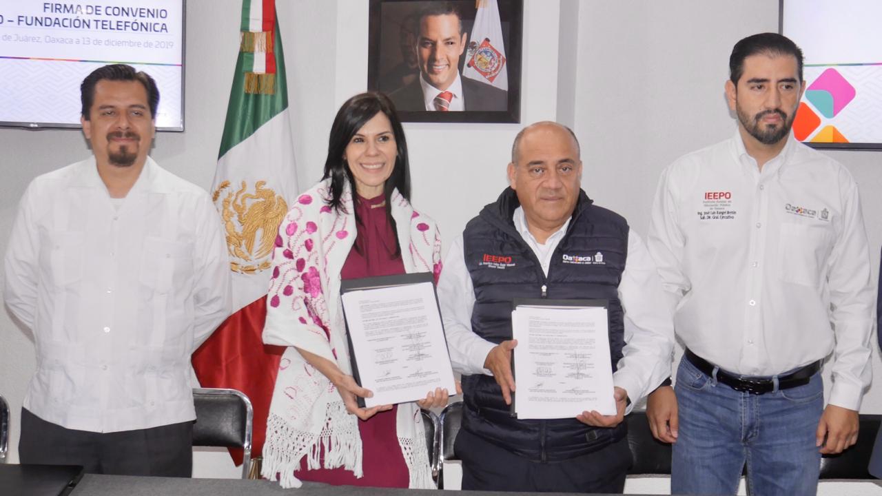 El director general del Instituto Estatal de Educación Pública de Oaxaca (IEEPO), Francisco Ángel Villarreal y la directora de la Fundación Telefónica México, Nidia Chávez, firmaron un convenio de colaboración para impulsar la formación de habilidades digitales en beneficio de más de dos mil 400 estudiantes y 135 docentes de educación básica en Oaxaca con el uso de la tecnología educativa.